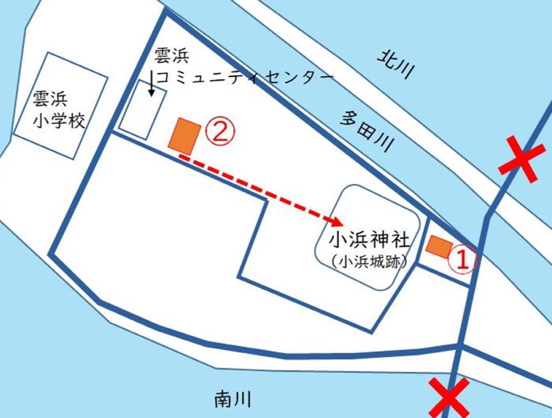 南川・北川橋は工事中のため、車での通行は出来ません。
