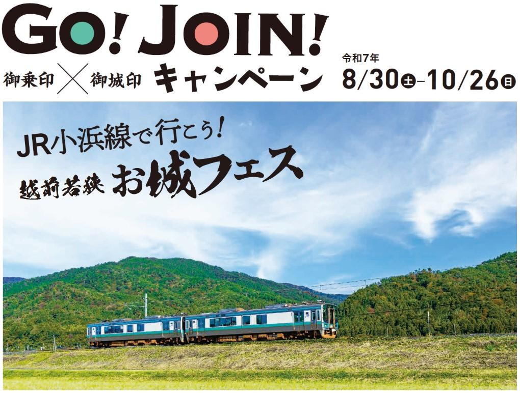 海、山、里の風景を車窓に見ながら若狭路を走るJR 小浜線。その沿線には、地域の歴史を刻んだ多くの城跡が残っています。 そんな「 ゆったり」とした時の流れを感じられる小浜線に乗って、鉄道と城跡めぐりを同時に楽しむ、のんびり旅に出かけてみませんか。小浜 線乗車&登城記念の「御乗印×御城印」キャンペーンは4年目を迎えました。今回は「越前若狭お城フェス」とのコラボ企画も実施します!駅から城跡 へ 、 そして越前若狭お城フェスへ、みんなで行こう! Go! Join!